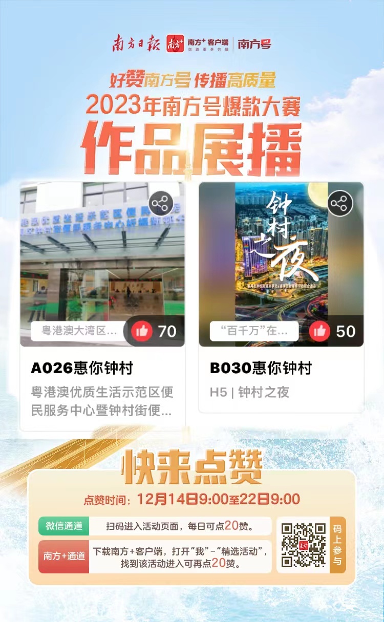 扫描海报二维码,搜索“钟村”即可为展播作品点赞加油!
